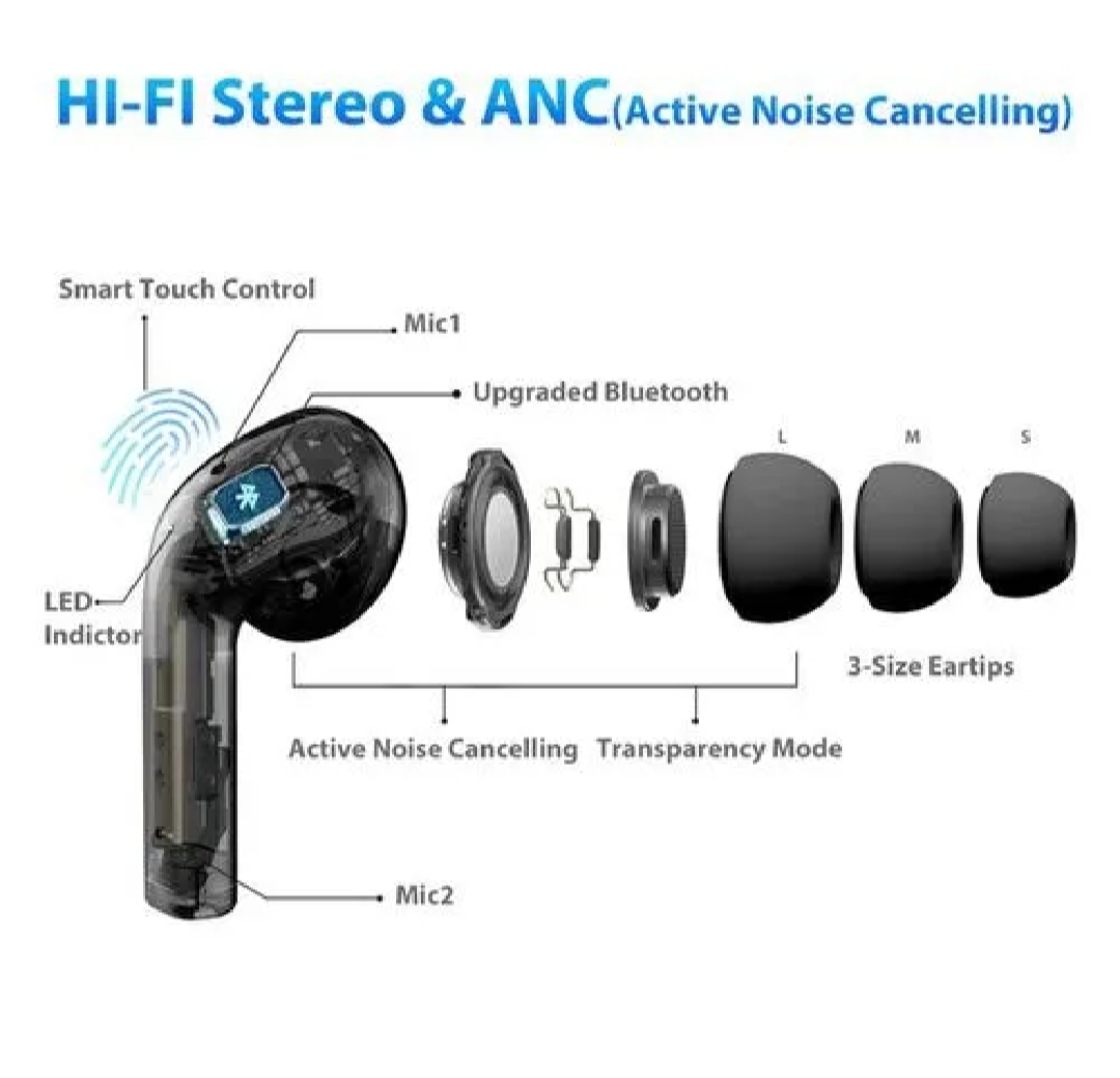 Equipped with **Active Noise Cancellation (ANC)**, the earbuds reduce unwanted background noise, allowing you to stay focused and fully immersed. The ergonomic design ensures a secure and comfortable fit, making them ideal for long listening sessions.